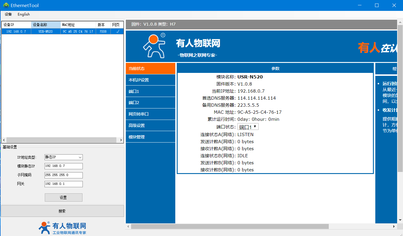 1.N520(USR-N520,簡稱 N520 下同)通過串口線(或USB 轉(zhuǎn)RS232串口線)將RS232接口與計(jì)算機(jī)相連接,通過網(wǎng)線將 N520的網(wǎng)口 與PC 的網(wǎng)口相連接,檢測硬件連接無錯(cuò)誤后,接入5V電源適配器,給其供電。觀察N520電源指示燈及工作指示燈狀態(tài)是否正常:紅燈常亮,綠燈閃爍。網(wǎng)口指示燈狀態(tài)是否正常:網(wǎng)口綠色燈常亮,黃色燈閃爍。
