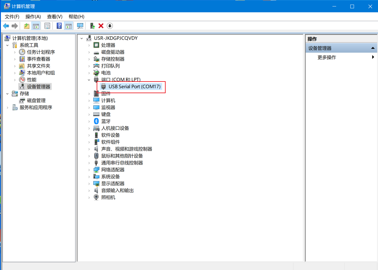 點(diǎn)擊“搜索設(shè)備”當(dāng)搜索列表中出現(xiàn)520的設(shè)備后,單擊搜索到的設(shè)備,查看其配置信息(上圖為默認(rèn)配置信息)。5.在設(shè)備管理器中查看端口信息,確定520串口使用的串口號,如下圖所示電腦端口號為COM17。