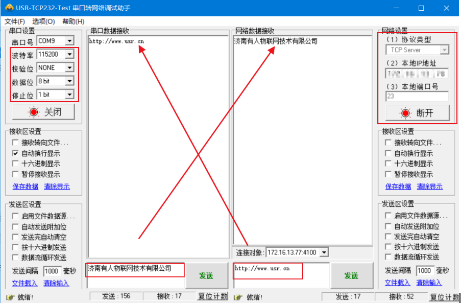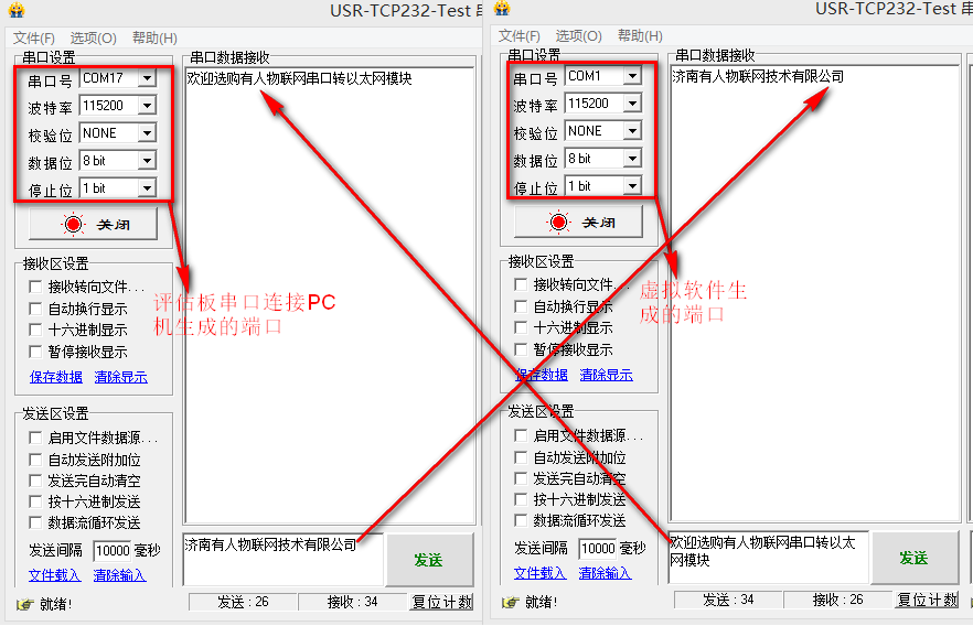 打開兩個(gè)USR_TCP232_Test軟件,一個(gè)連接COM17,一個(gè)連接虛擬串口COM1,實(shí)現(xiàn)兩個(gè)串口直接數(shù)據(jù)互發(fā)。