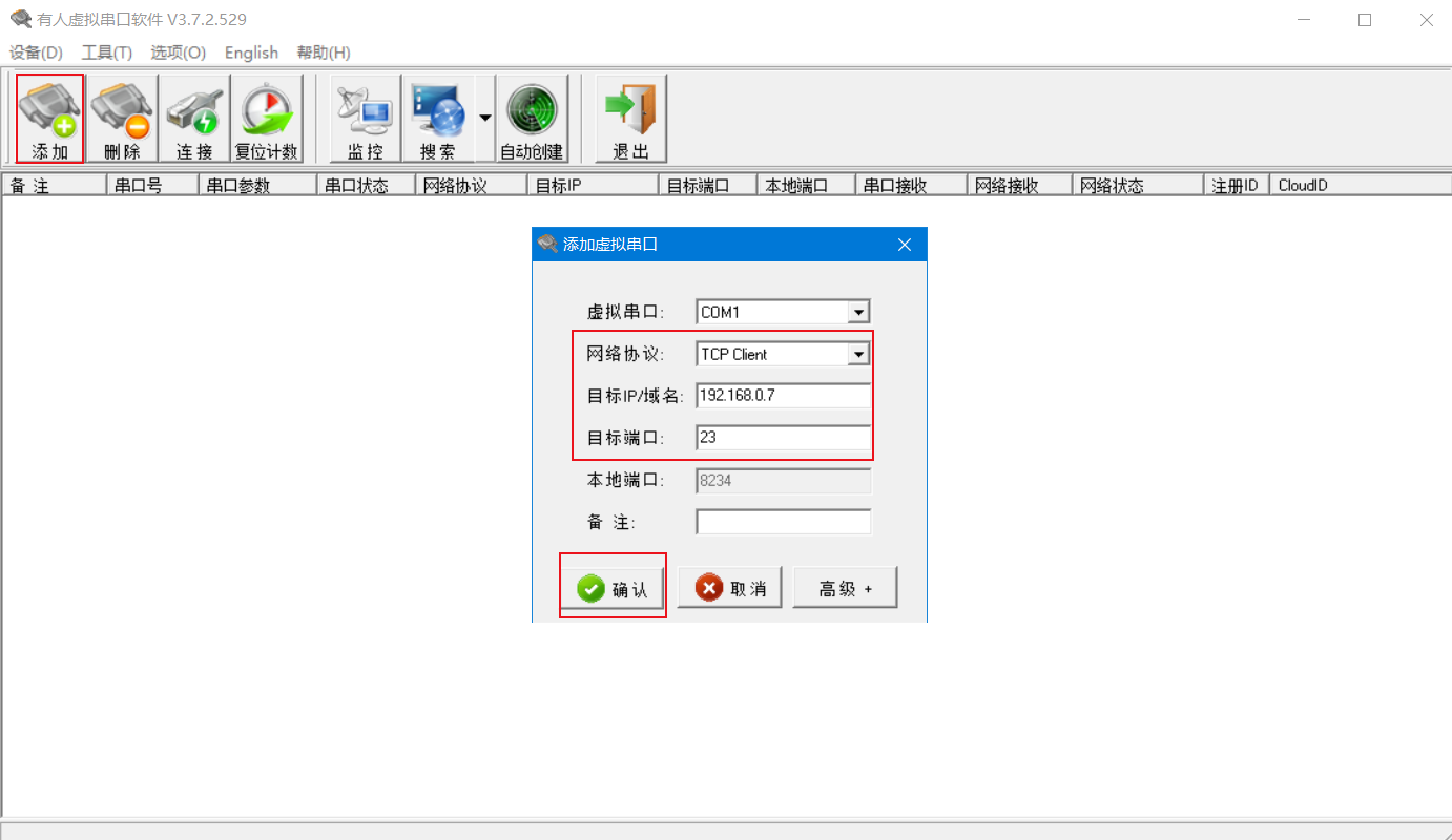 打開虛擬串口軟件,點(diǎn)擊“添加”在彈出的窗口中設(shè)置虛擬串口信息,由于上述N520設(shè)備采用TCP SERVER協(xié)議,所以此處網(wǎng)絡(luò)協(xié)議設(shè)置為TCP CLIENT。目標(biāo)IP設(shè)置為N520的IP:192.168.0.7 目標(biāo)端口號為N520 端口1的本地端口號:23,然后點(diǎn)擊“確定”,建立虛擬串口COM1。