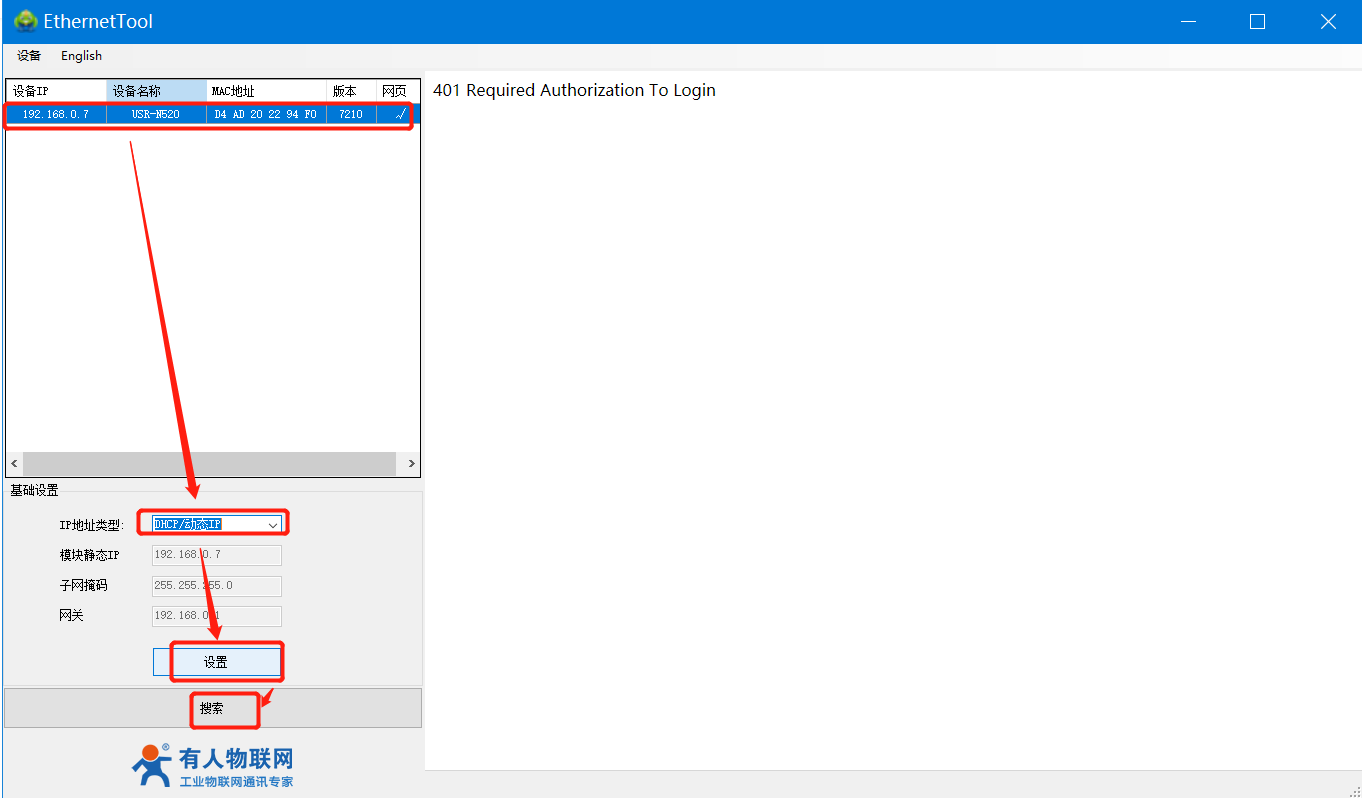 1>設(shè)置USR-N520的IP地址:打開設(shè)置軟件--搜索--點(diǎn)擊設(shè)備--選擇DHCP/動(dòng)態(tài)IP--點(diǎn)擊設(shè)置