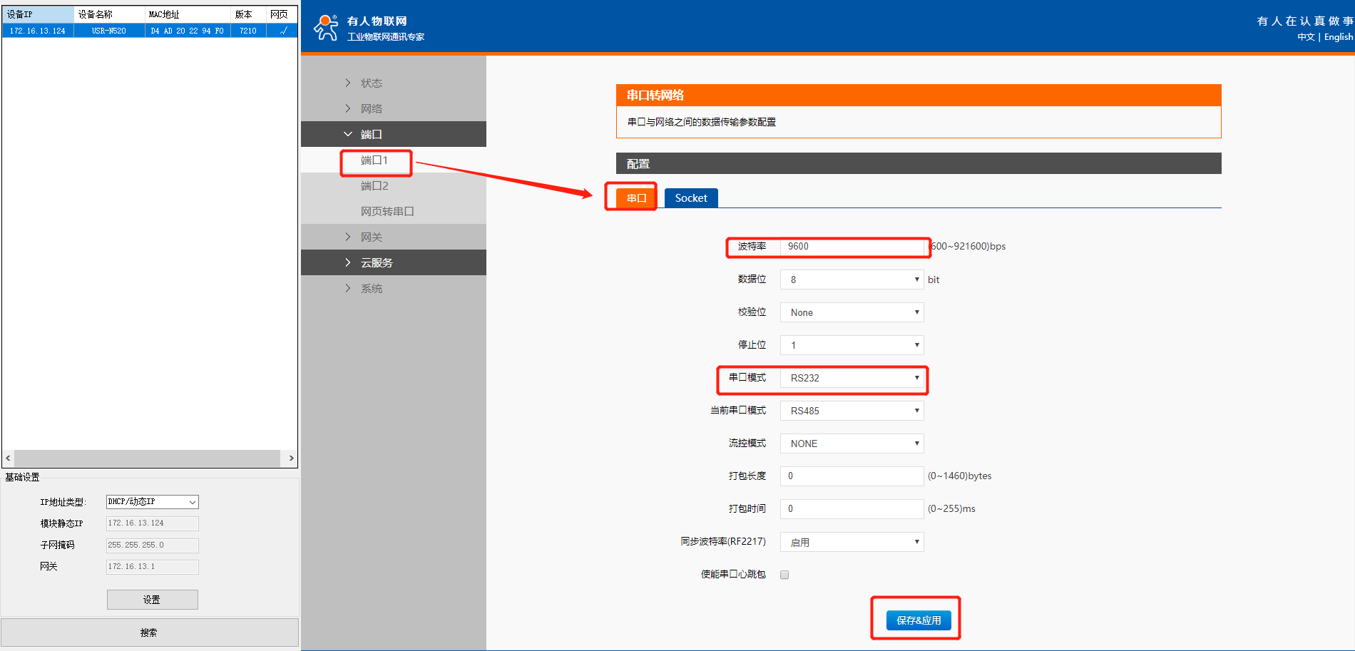 本案例中,波特率修改為9600,串口模式設(shè)置為RS232,只修改了這2個(gè)參數(shù)