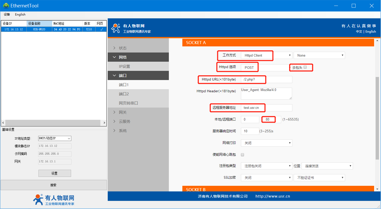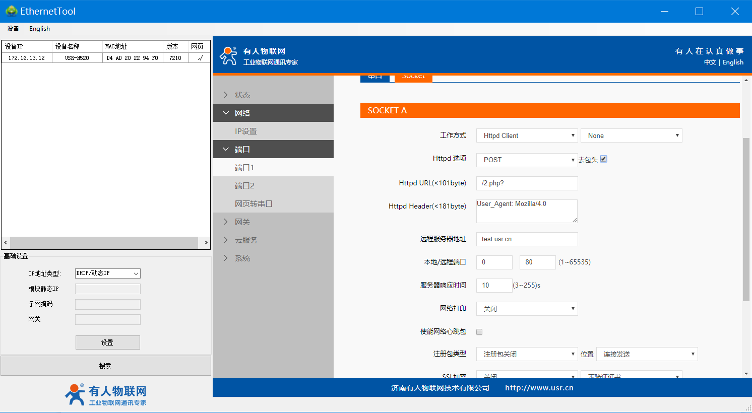 注意:上述參數(shù)是用我司的http測(cè)試服務(wù)器,如果客戶接自己的http服務(wù)器,需要根據(jù)實(shí)際情況修改參數(shù)