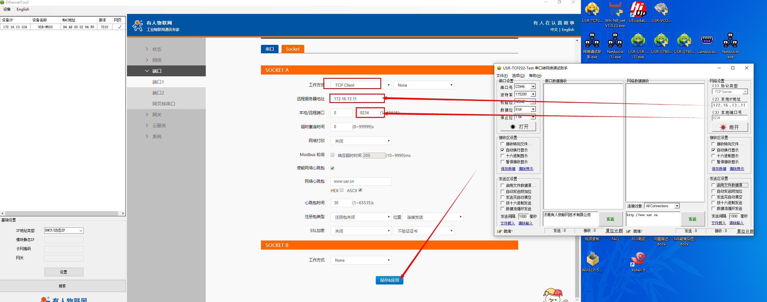 9)繼續(xù)在軟件中配置socket參數(shù),工作方式選擇tcp client,將服務器的IP以及端口填入到設備中,設置完成后點擊保存并應用。全部參數(shù)設置完成后,點擊重啟。參數(shù)重啟后生效