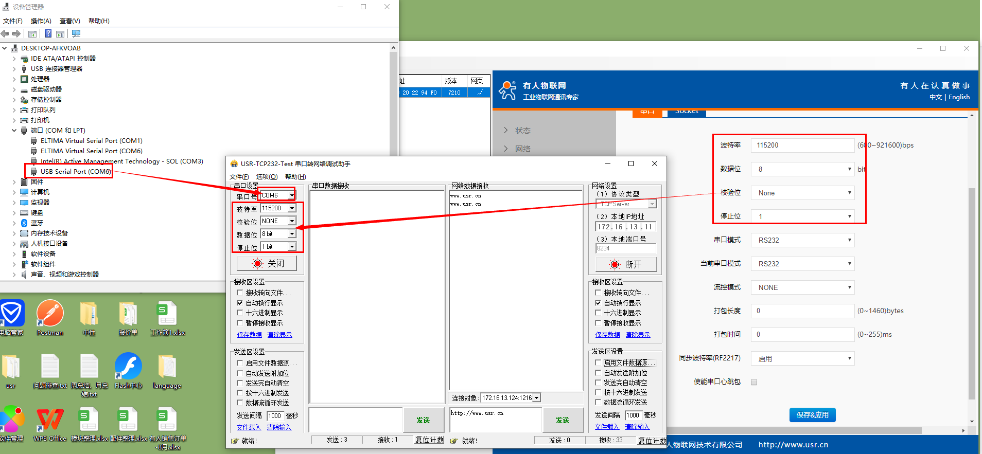 1)硬件連接:N520-H7的串口1通過USB轉232/485連接到電腦USB口,同時N520-H7的網口通過網線也連接到電腦網口上