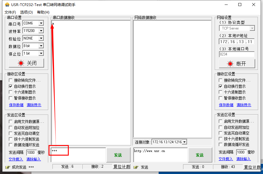 12)可以先判斷一下串口是否通了,可以在串口發(fā)送+++,如果設備收到+++后會自動返回a,所以如果收到a就說明串口已經通了