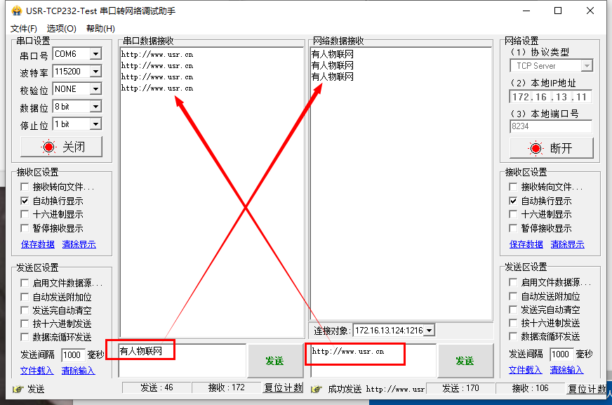 13)串口發(fā)送任意數(shù)據(jù),可以在網絡服務器接收,網絡服務器下發(fā)的任意數(shù)據(jù),也可以在串口接收。證明數(shù)據(jù)雙向透傳沒有問題,至此測試結束