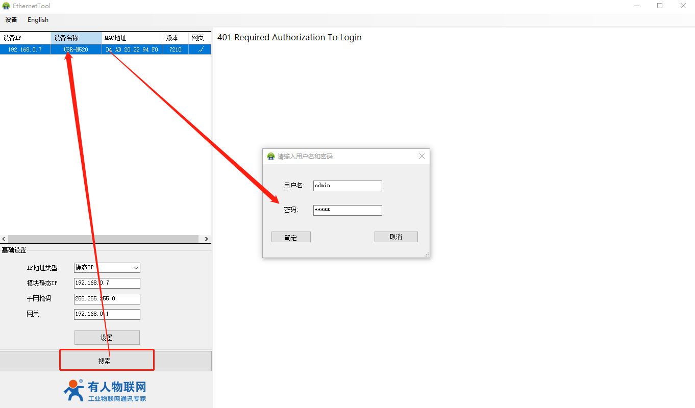3)打開N520-H7設(shè)置軟件,搜索----雙擊選中設(shè)備----用戶名,密碼出廠默認均為admin