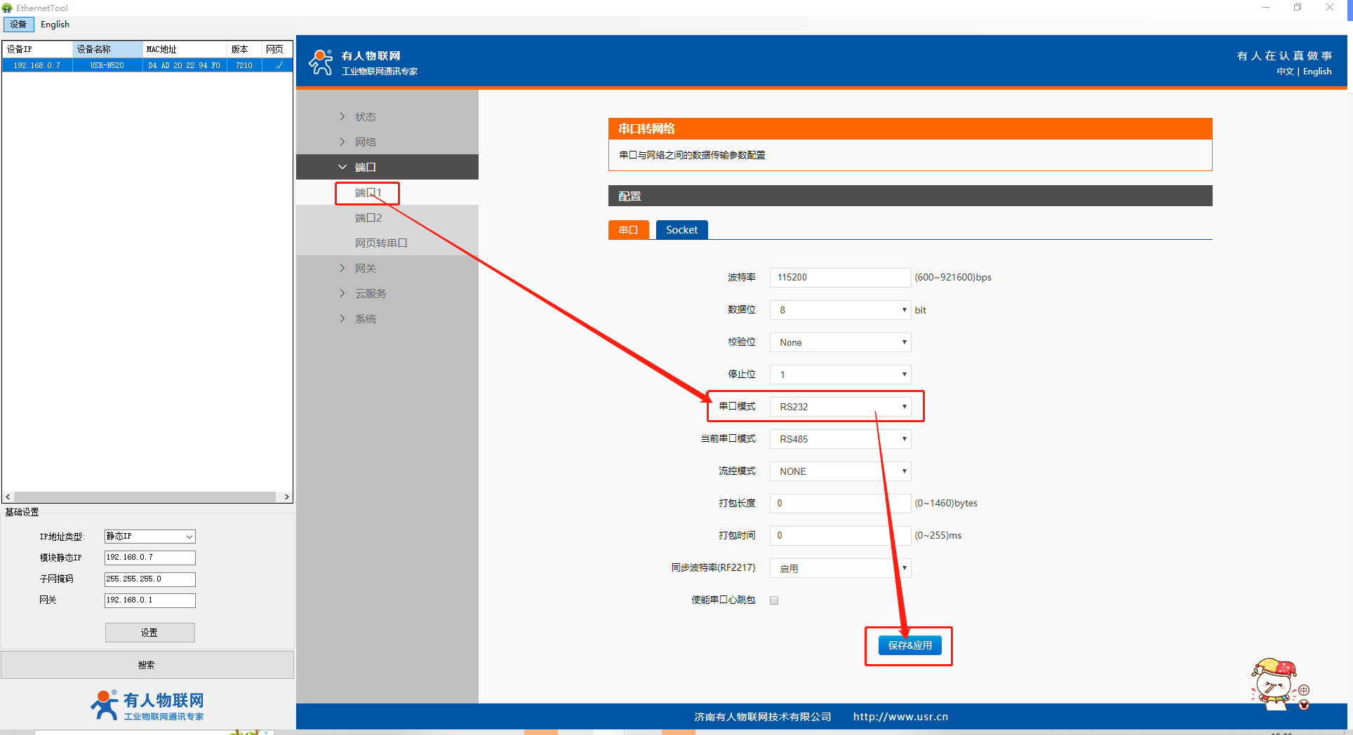6)打開設(shè)置軟件,在端口處設(shè)置設(shè)備參數(shù),此處使用串口1的322串口進行測試,所以需要選擇端口1(若使用串口2,則選擇端口2即可),串口模式選擇RS232(若使用485串口,串口模式選擇RS485即可),設(shè)置完此界面點擊下方保存并應(yīng)用,彈出提示后選擇繼續(xù)配置,所有參數(shù)都設(shè)置完之后再重啟就可以