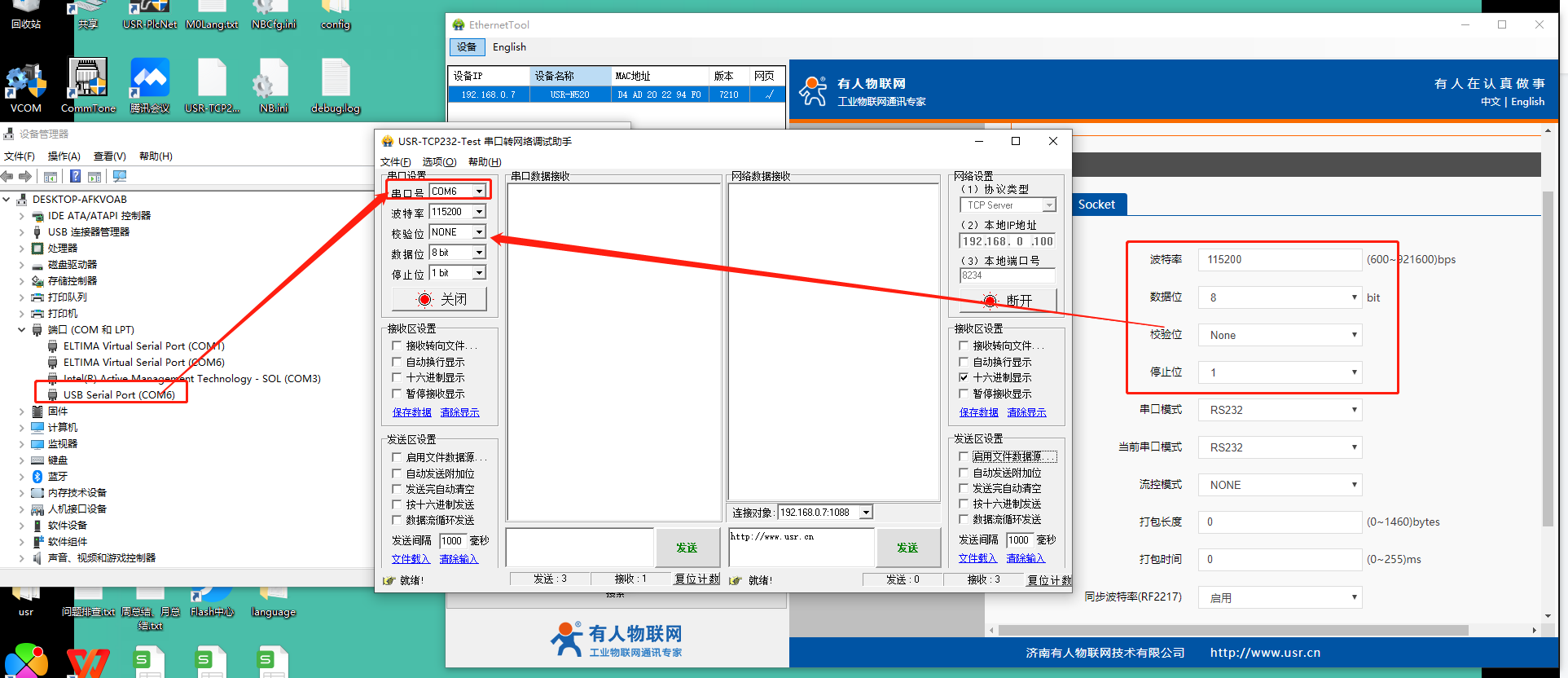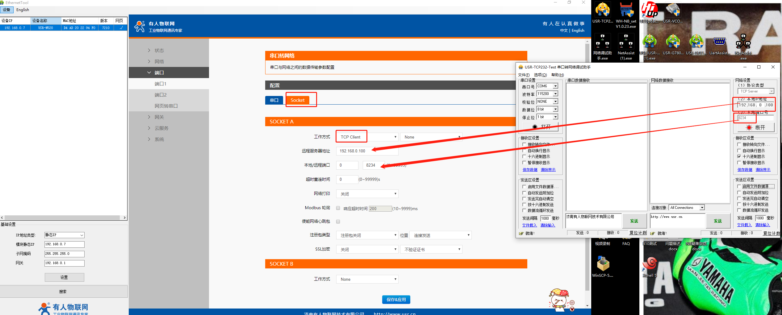 1)硬件連接:N520-H7的串口1通過USB轉(zhuǎn)232/485連接到電腦USB口,同時N520-H7的網(wǎng)口通過網(wǎng)線也連接到電腦網(wǎng)口上