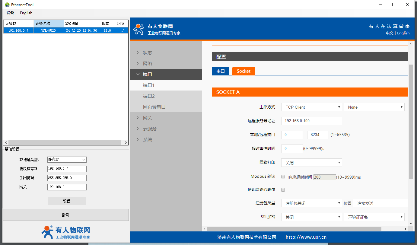 7)繼續(xù)在軟件中配置socket參數(shù),工作方式選擇tcp client,將服務(wù)器的IP以及端口填入到設(shè)備中,設(shè)置完成后點擊保存并應(yīng)用。全部參數(shù)設(shè)置完成后,點擊重啟。參數(shù)重啟后生效