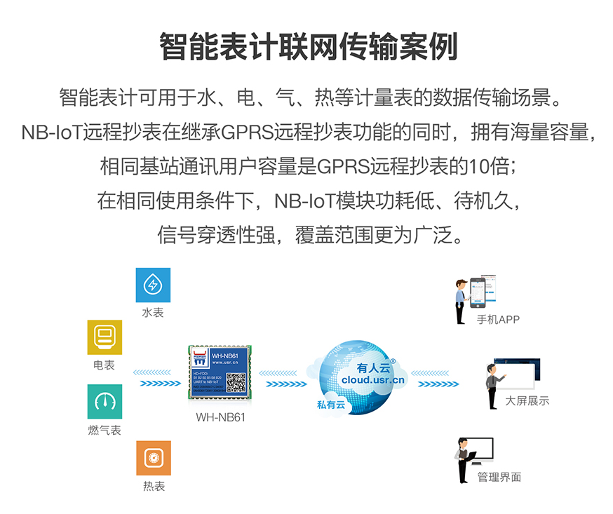 智能表計(jì)可用于水、電、氣、熱等計(jì)量表的數(shù)據(jù)傳輸場(chǎng)景。NB-IOT遠(yuǎn)程抄表在繼承GPRS遠(yuǎn)程抄表功能的同時(shí),擁有海量容量,相同基站通訊用戶容量是GPRS遠(yuǎn)程抄表的10倍;在相同使用條件下,NB-IOT模塊功耗低、待機(jī)久。信號(hào)穿透性強(qiáng),覆蓋范圍更為廣泛