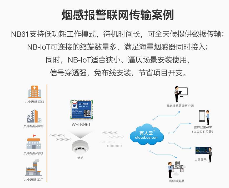 NB61支持低功耗工作模式,待機(jī)時(shí)間長(zhǎng),可全天候提供數(shù)據(jù)傳輸;NB-IOT可連接的終端數(shù)量多,滿足海量煙感器同時(shí)接入;同時(shí)NB-IOT適合狹小、逼仄場(chǎng)景安裝使用,信號(hào)穿透強(qiáng),免布線安裝,節(jié)省項(xiàng)目開支