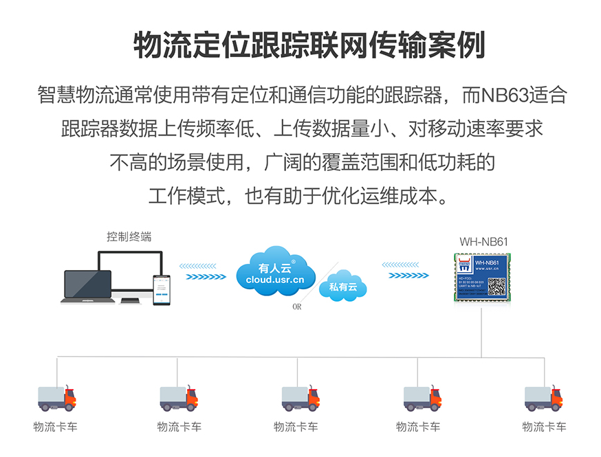 智慧物流通常使用帶有定位和通信功能的跟蹤器,而NB61適合跟蹤器數(shù)據(jù)上傳頻率低、上傳數(shù)據(jù)量小、對(duì)移動(dòng)速率要求不高的場(chǎng)景使用,廣闊的覆蓋范圍和低功耗的工作模式,也有助于優(yōu)化運(yùn)維成本