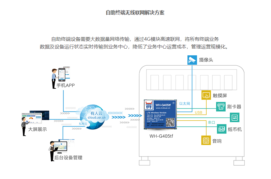 自助終端設(shè)備需要大數(shù)據(jù)量網(wǎng)絡(luò)傳輸,通過4G模塊高速聯(lián)網(wǎng),將所有終端業(yè)務(wù)數(shù)據(jù)及設(shè)備運(yùn)行狀態(tài)實(shí)時(shí)傳輸?shù)綐I(yè)務(wù)中心,降低了業(yè)務(wù)中心運(yùn)營(yíng)成本,管理運(yùn)營(yíng)規(guī)?;?/span>