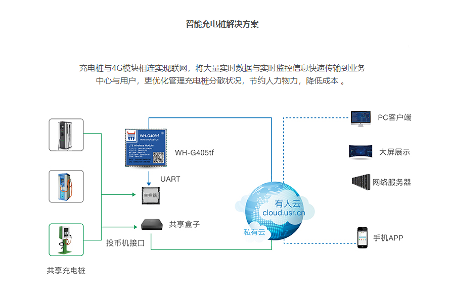 充電樁與4G模塊相連實(shí)現(xiàn)聯(lián)網(wǎng),將大量實(shí)時(shí)數(shù)據(jù)與實(shí)時(shí)監(jiān)控信息快速傳輸?shù)綐I(yè)務(wù)