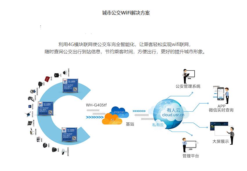 利用4G模塊聯(lián)網(wǎng)使公交車完全智能化,讓乘客輕松實(shí)現(xiàn)wifi聯(lián)網(wǎng),隨時(shí)查詢公交出行到站信息,節(jié)約乘客時(shí)間,方便出行,更好的提升城市形象