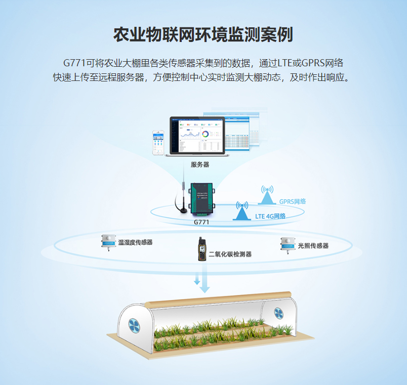 G771可將農(nóng)業(yè)大棚里各類傳感器采集到的數(shù)據(jù),通過LTE或GPRS網(wǎng)絡(luò)快速上傳至遠(yuǎn)程服務(wù)器,方便控制中心實(shí)時(shí)監(jiān)測(cè)大棚動(dòng)態(tài),及時(shí)作出相應(yīng)