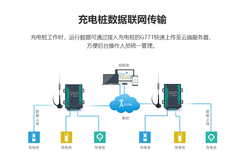 充電樁工作時(shí),運(yùn)行數(shù)據(jù)可通過接入充電樁的G771快速上傳至云端服務(wù)器,方便后臺(tái)操作人員統(tǒng)一管理