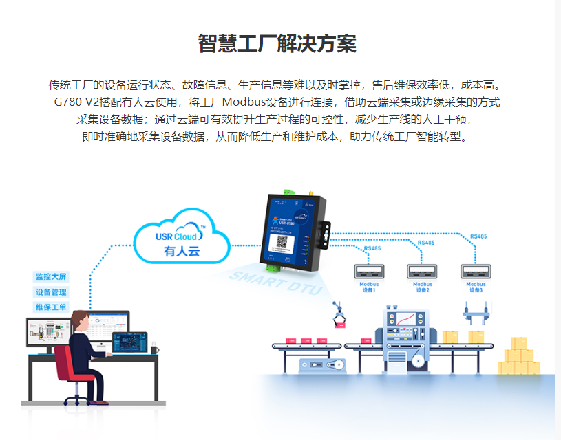 G780 V2搭配有人云使用,將工廠Modbus設(shè)備進(jìn)行連接,借助云端采集或邊緣采集的方式采集設(shè)備數(shù)據(jù);通過云端可有效提升生產(chǎn)過程的可控性,減少生產(chǎn)線的人工干預(yù),即時(shí)準(zhǔn)確的采集設(shè)備數(shù)據(jù),從而降低生產(chǎn)和維護(hù)成本,助力傳統(tǒng)工廠智能轉(zhuǎn)型