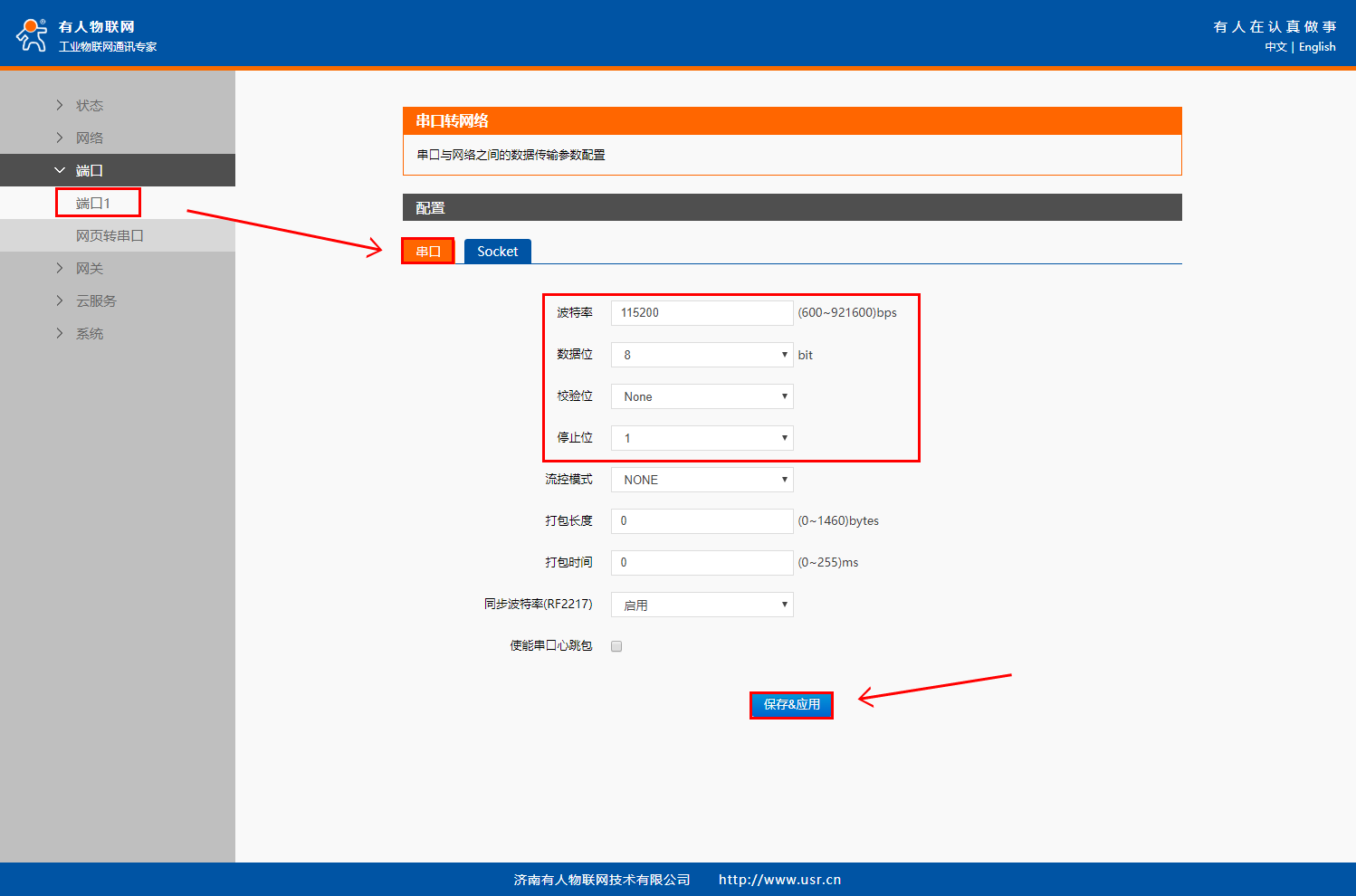 串口波特率/檢驗位/數(shù)據(jù)位/停止位修改與串口設(shè)備的串口參數(shù)一致,默認(rèn)為115200波特率,無校驗位(NOEN)數(shù)據(jù)位8,停止位1。