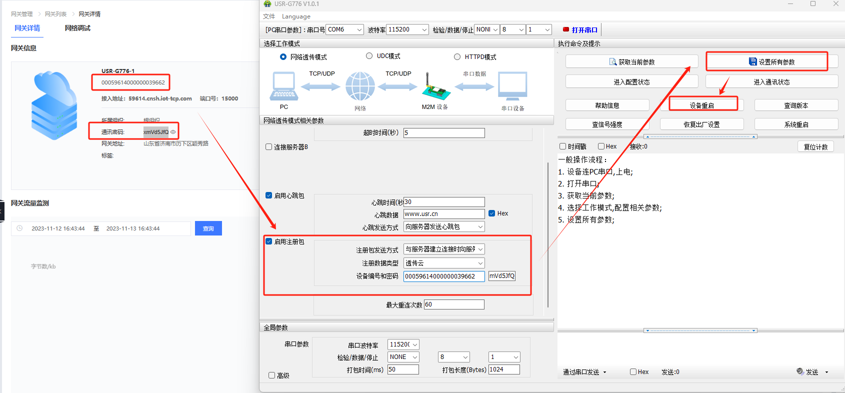 7、啟用注冊包,注冊包發(fā)送方式選擇為“與服務器連接時向服務器發(fā)送”,注冊類型選擇透傳云,設備編號和密碼在云平臺設備列表查看具體設備SN和密碼,填寫無誤后點擊設置并保存所有參數(shù)。