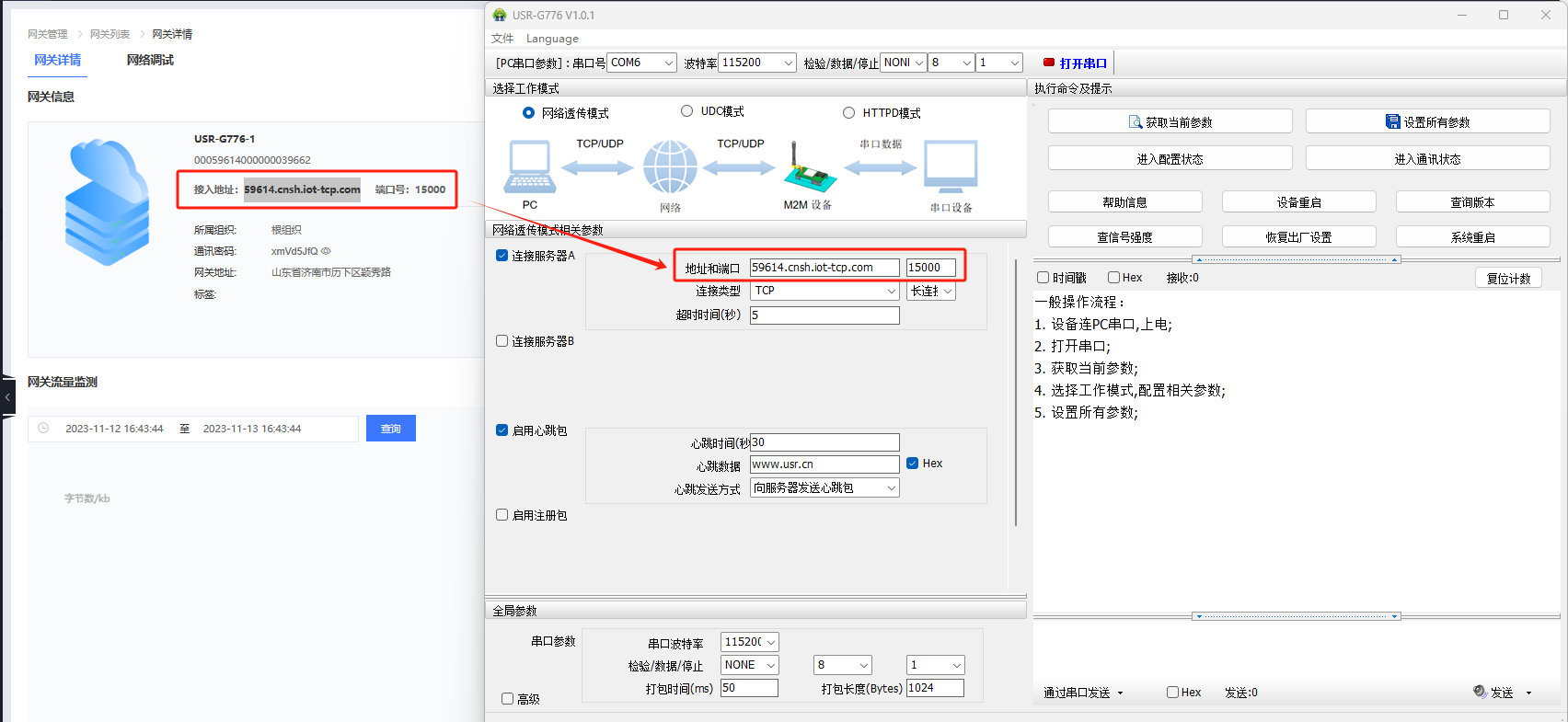 6、有人云打開網(wǎng)關管理--網(wǎng)關列表--點“USR-G776-1”的名稱,跳轉(zhuǎn)到網(wǎng)關詳情頁面,配置軟件上工作模式選擇網(wǎng)絡透傳模式,服務器A填寫有人云平臺的接入地址和端口