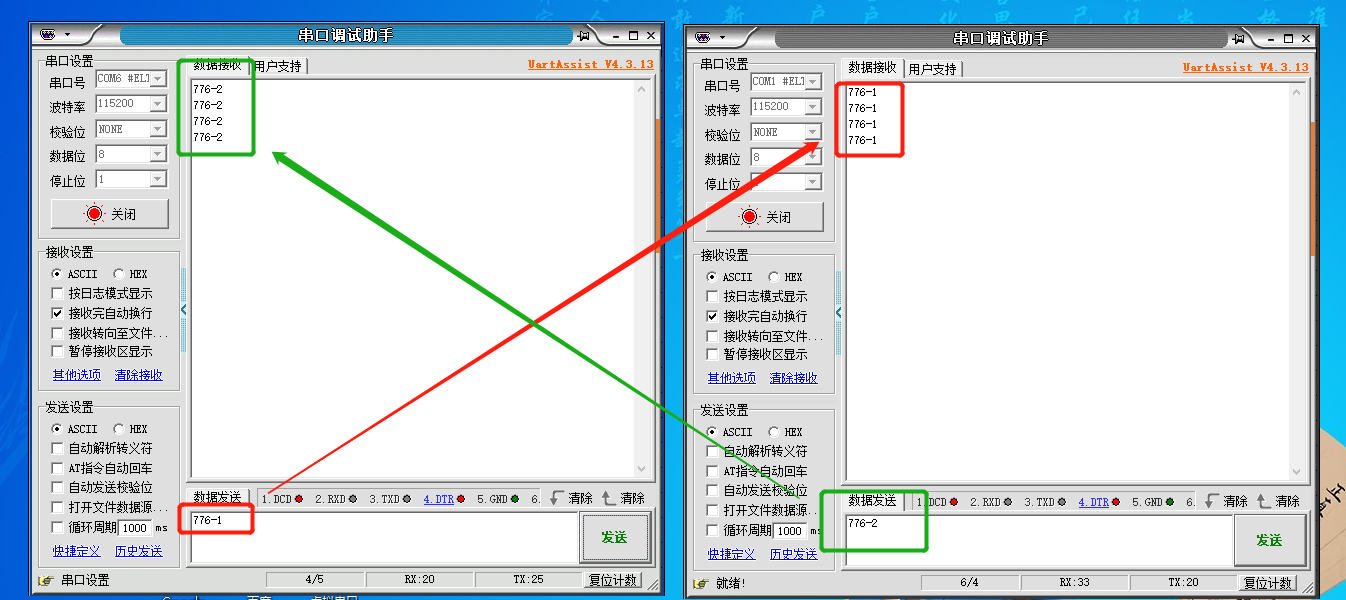 10、打開兩個串口調(diào)試助手軟件,選擇正確的串口以及串口參數(shù),分別打開設備插在電腦上識別到的COM口,具體數(shù)據(jù)測試截圖如下: