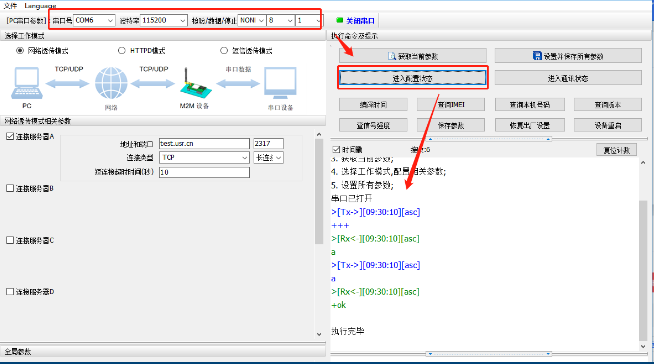 5、打開776設置軟件,PC串口參數(shù)選擇設備此時的串口參數(shù),默認是115200,N,8,1。如果之前有配置過其他參數(shù),比如波特率配置成了9600,再此處就要選擇9600,N,8,1進入配置狀態(tài)。返回OK代表正確進入配置狀態(tài)。