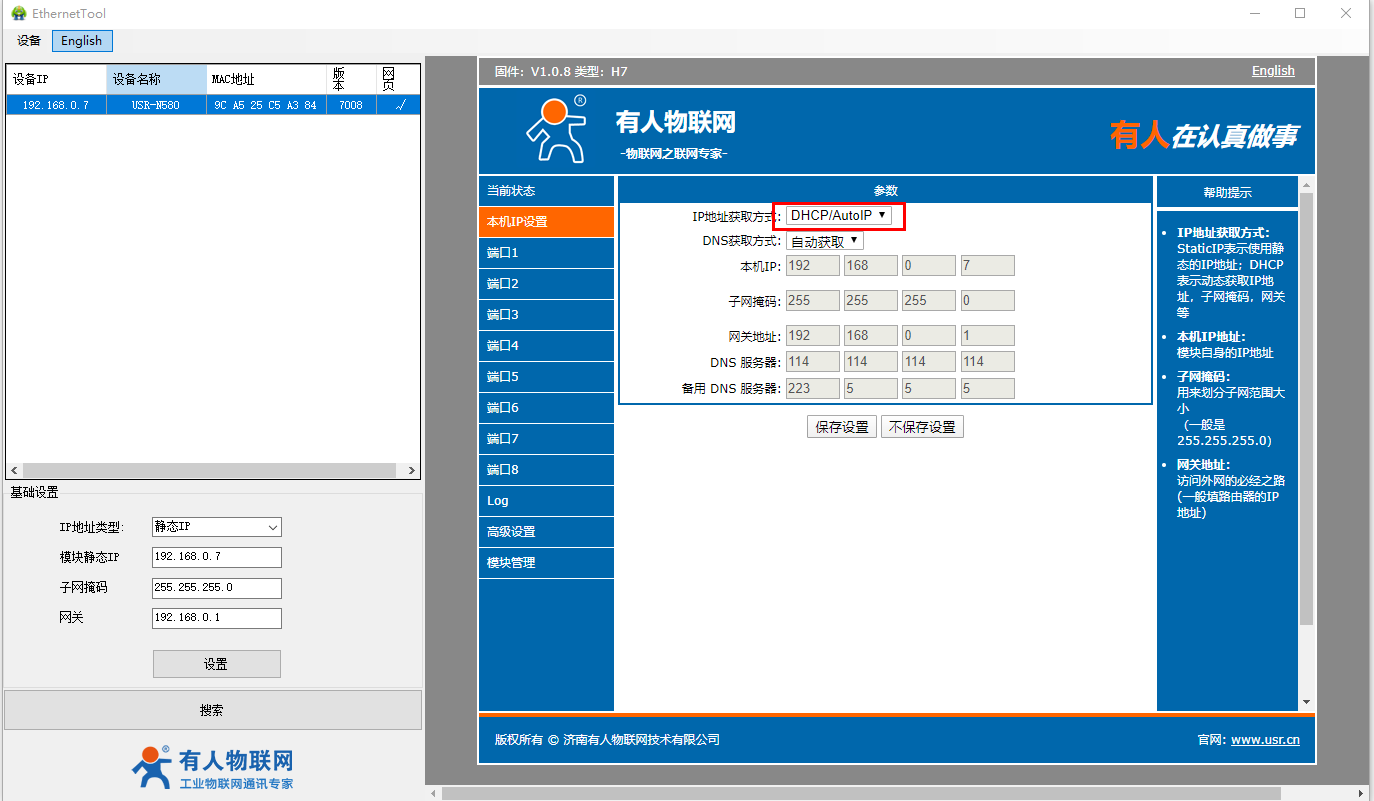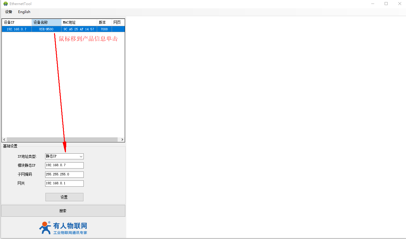 顯示IP 192.168.0.7之后,鼠標單擊產(chǎn)品信息,基礎(chǔ)設(shè)置顯示IP類型、IP、子網(wǎng)掩碼、網(wǎng)關(guān)信息。