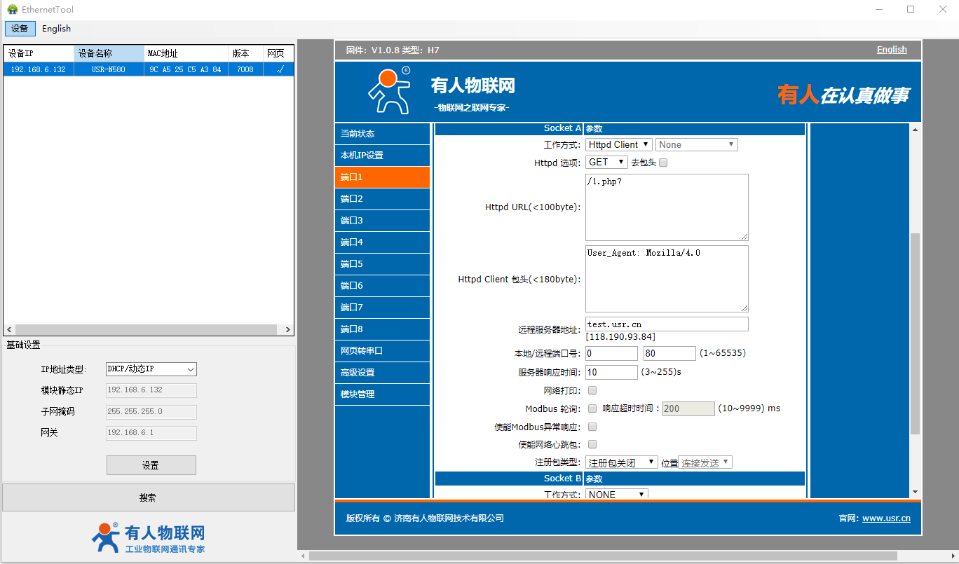N580端口1工作方式設(shè)置HTTPD模式,GET,遠程服務(wù)器地址填test.usr.cn,遠程端口填80,本地端口號設(shè)置為0。URL填/1.php?,不濾除報頭。