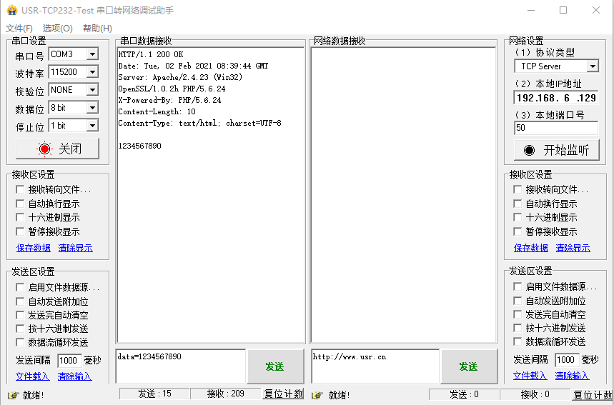 打開串口網(wǎng)絡(luò)助手,串口參數(shù)和N580 端口1參數(shù)保持一致,串口發(fā)送數(shù)據(jù)data=1234567890,測試服務(wù)器返回數(shù)據(jù)。