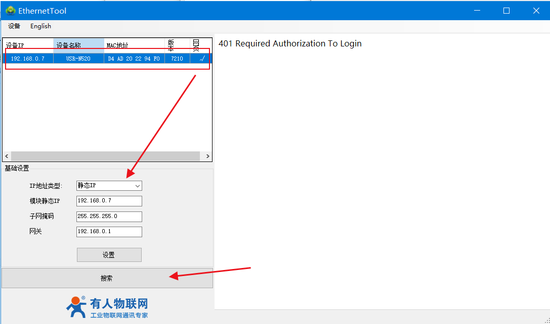 5、網(wǎng)線直連N520的網(wǎng)口和路由器的LAN口,保證N510正常上網(wǎng),電腦連接路由器的WiFi,電腦和路由器同一網(wǎng)段,設(shè)置軟件重新搜索設(shè)備,可看到路由器分配給N510的IP。