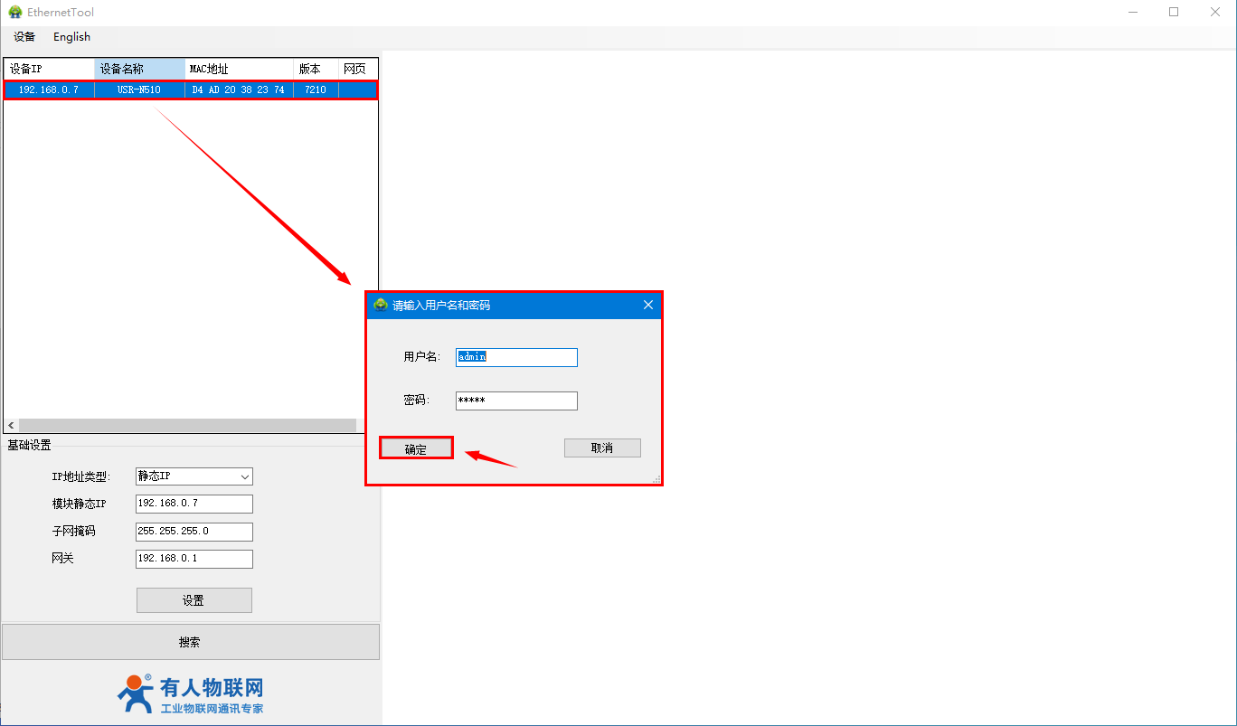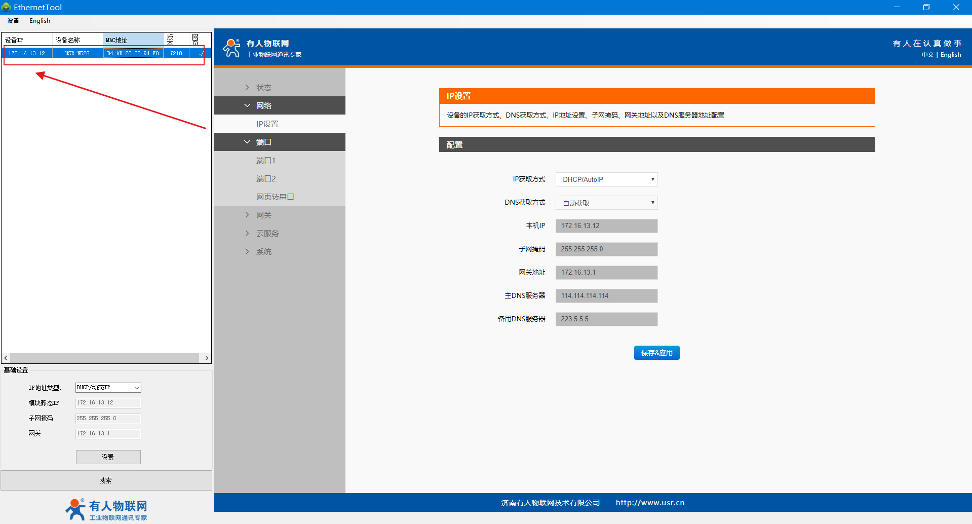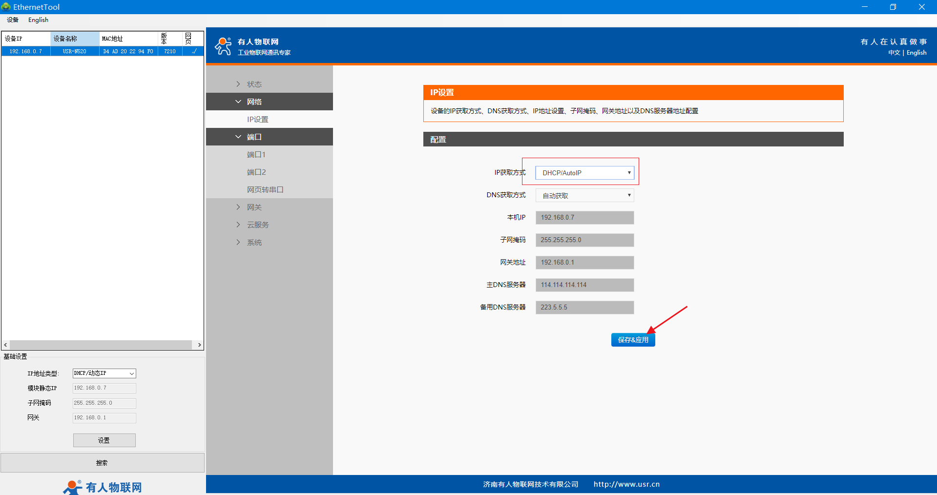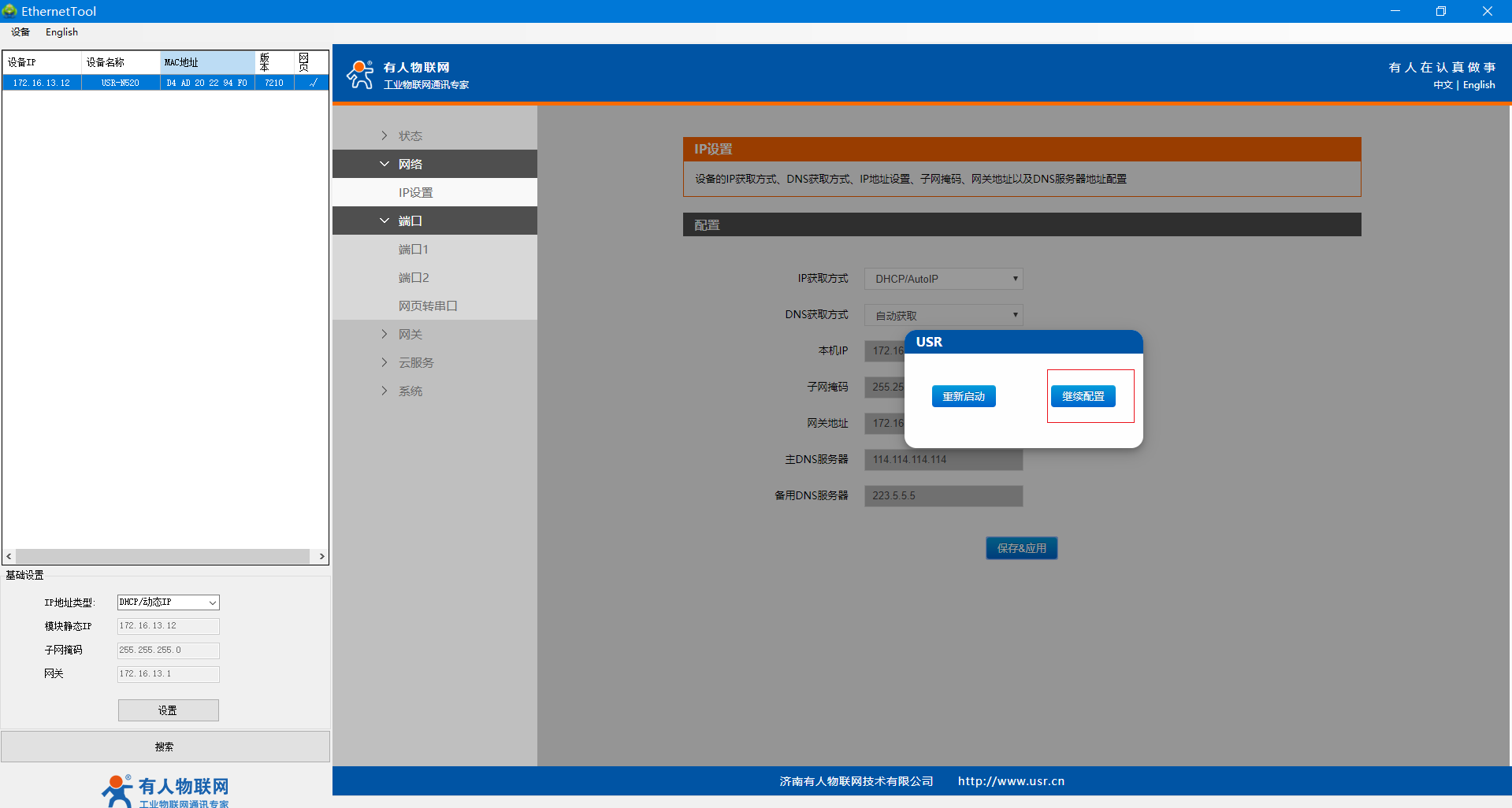 3、打開H7設(shè)置軟件,點(diǎn)擊搜索設(shè)備,點(diǎn)擊選中,可以看到IP地址為靜態(tài)IP。4、更改IP地址類型為DHCP/動(dòng)態(tài)IP,點(diǎn)擊基礎(chǔ)設(shè)置保存,設(shè)備重啟使參數(shù)生效。