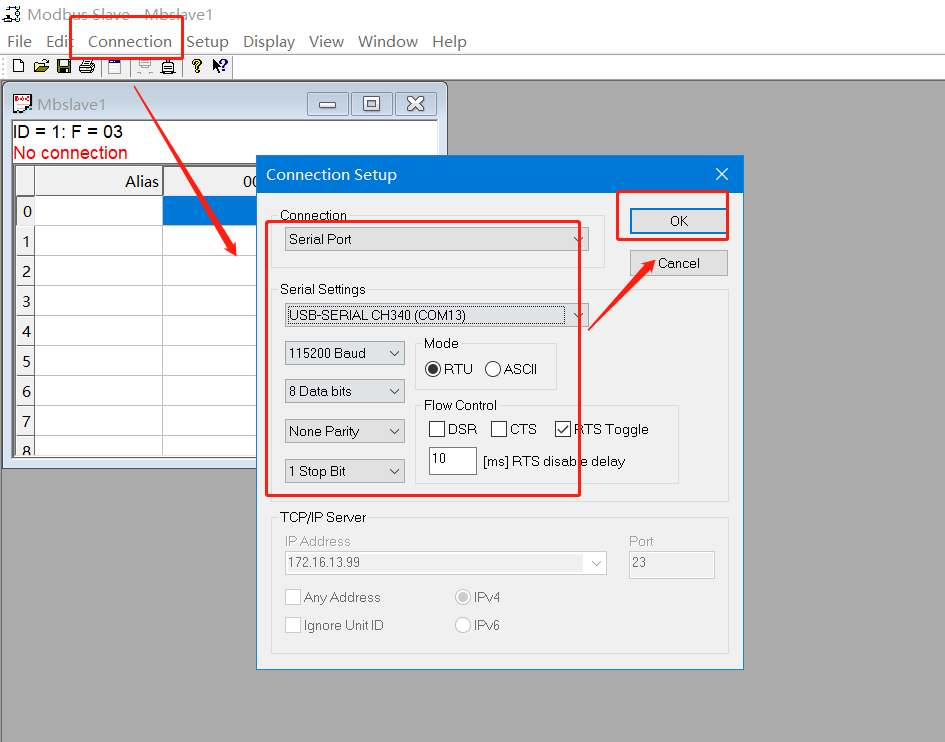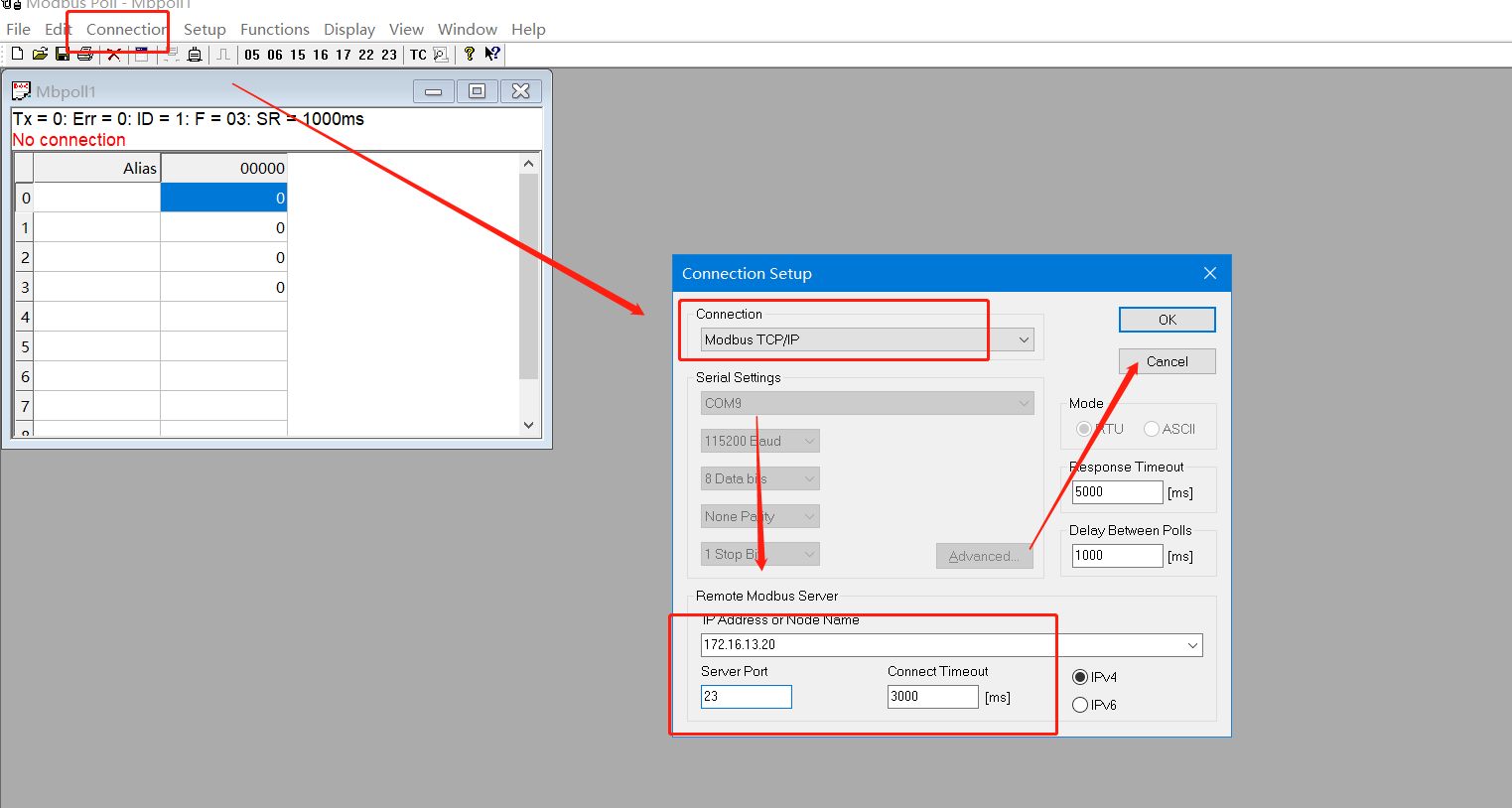 使用 modbus Poll 模擬云端進行查詢,“Connection”--“connect”界面配置連接參數: