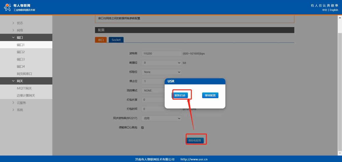 (3) 點擊“保存&應用”,會彈出提示框,因此例中所有的配置項均已配置完成,所以點擊“重新啟動”,令配置生效。 設備中的所有功能,配置完成都需要點擊下方保存按鍵,最終需要重啟后生效。以下不再提示。