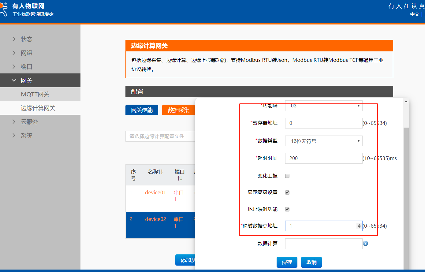 (1)映射的功能僅服務于邊緣查詢功能,開啟映射功能后,云端查詢(modbusRTU/TCP 查詢)的指令需要將讀指令中的從機號和寄 存器地址替換為映射后的值。數據采集、數據上報不受任何影響,按原本的從機號和寄存器地址進行采集、解析、上報。