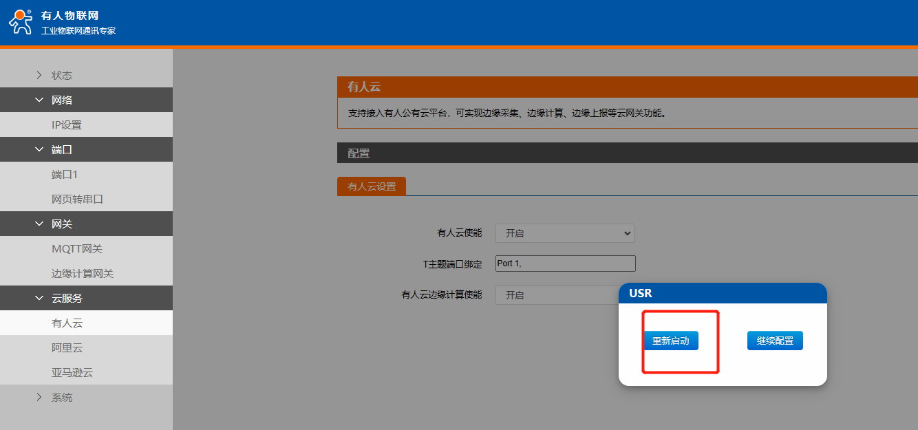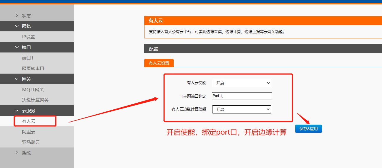 4、開(kāi)啟有人云使能,并綁定port端口,開(kāi)啟邊緣計(jì)算使能,保存參數(shù),重啟N5X0。