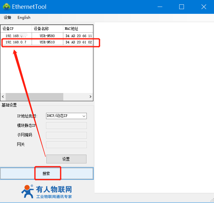 2、打開(kāi)H7設(shè)置軟件,當(dāng)搜索列表中出現(xiàn)N5X0的設(shè)備后,單擊設(shè)備,輸入用戶名和密碼都是admin,ip設(shè)置為動(dòng)態(tài)獲取DHCP。