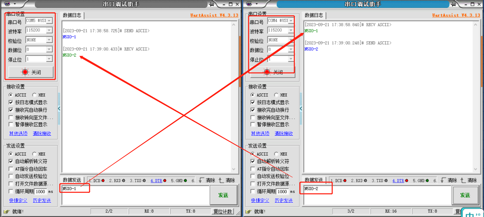 2個(gè)N5X0分別接485轉(zhuǎn)usb串口線到電腦,電腦設(shè)備管理器會(huì)生成2個(gè)com口,分別打開(kāi)2個(gè)串口助手,選擇好對(duì)應(yīng)的串口參數(shù),進(jìn)行數(shù)據(jù)互發(fā)測(cè)試。