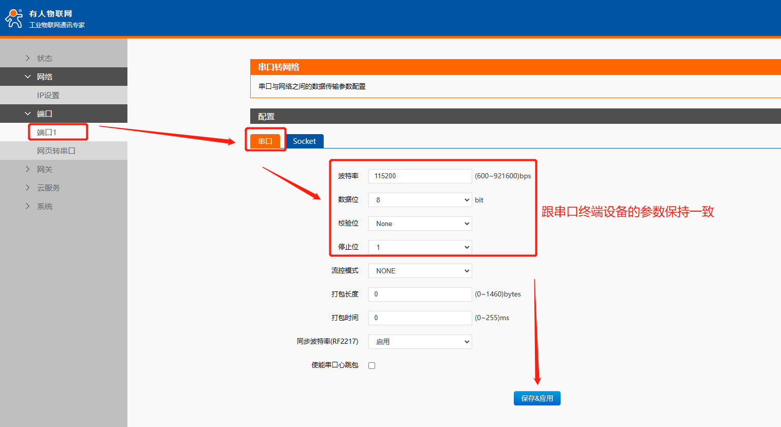 3、點(diǎn)擊端口1,配置串口參數(shù)跟終端設(shè)備參數(shù)保持一致。