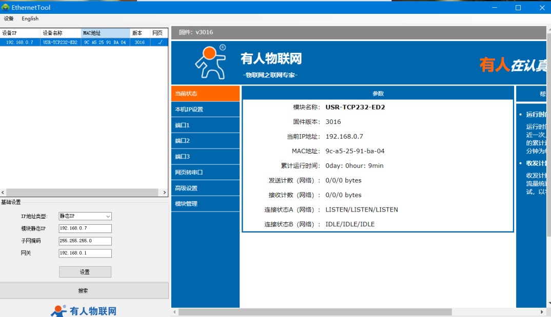 USR-TCP232-ED2的串口網(wǎng)絡(luò)調(diào)試工具:http://helipaomo.cn/Download/27.html