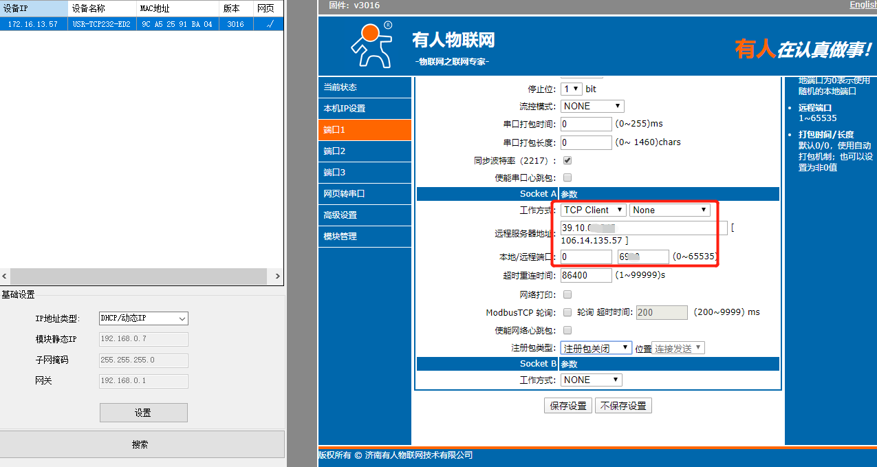 ED2的端口1工作方式設(shè)置TCP Client模式,填寫服務(wù)器的IP地址和端口號(用戶在使用時不可以依照此ip與端口來進行配置),需要連接自己遠程服務(wù)器的ip與端口。
