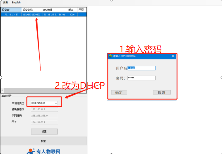 將IP地址獲取方式從靜態(tài) IP改為DHCP,保存設(shè)置,單擊搜索,找到設(shè)備之后,單擊產(chǎn)品名稱信息彈出輸入用戶名admin和密碼admin,點擊確定。在右上角點擊中英文切換