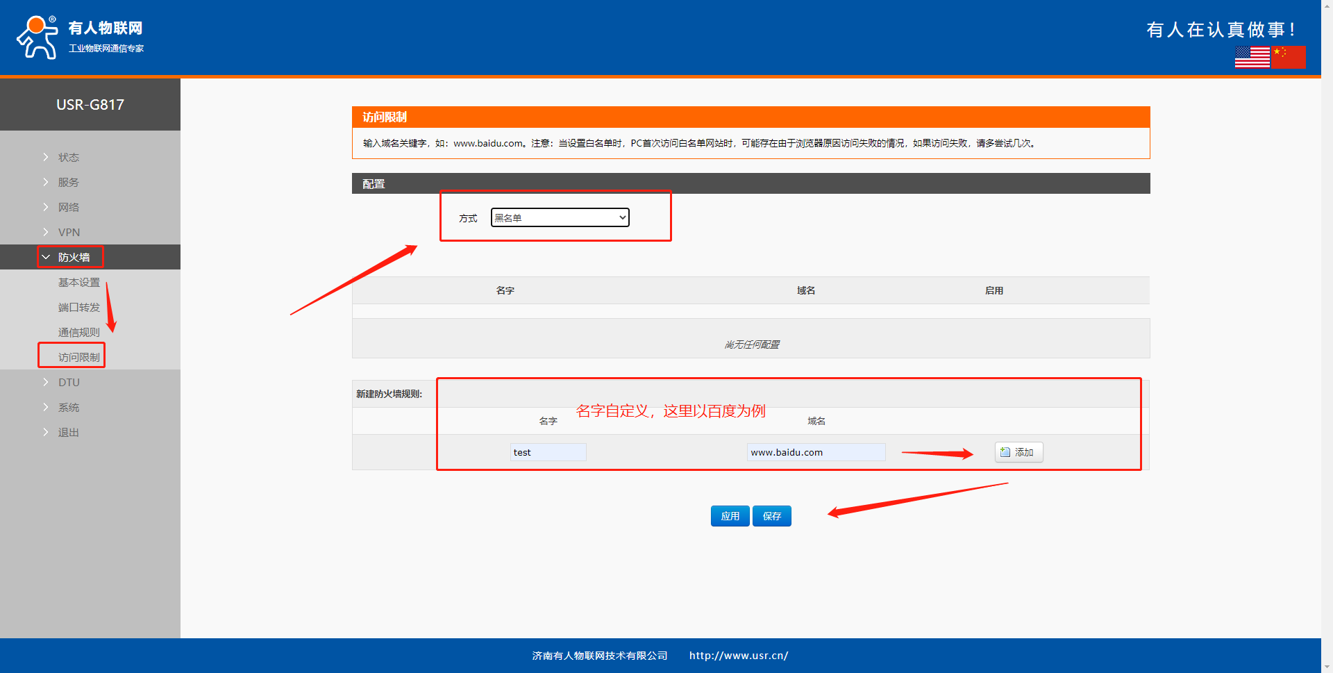 <1>方式選擇黑名單,新建防火墻規(guī)則中名字可自擬,域名即為要禁止的正確域名,點擊添加,然后點擊報保存,規(guī)則立即生效