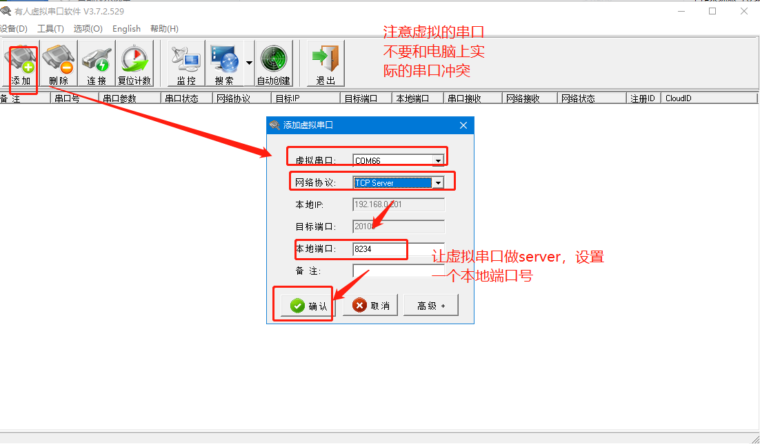 5、打開下載的虛擬串口軟件,創(chuàng)建虛擬串口。選擇一個電腦設(shè)備管理器中不存在的一個串口號COM66, 自定義一個TCP端口:8234,點(diǎn)擊確定,電腦上會出現(xiàn)虛擬的COM口號。