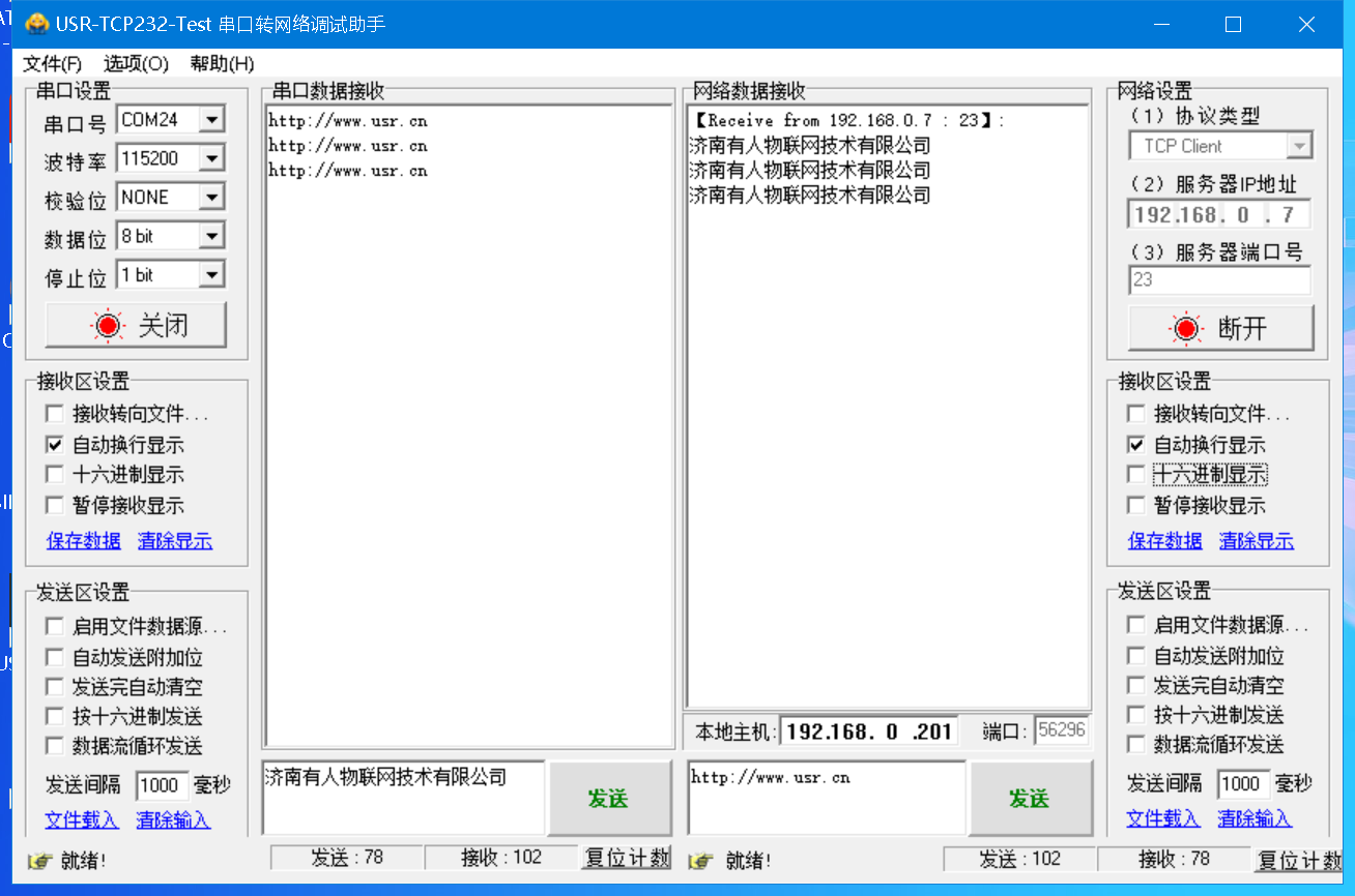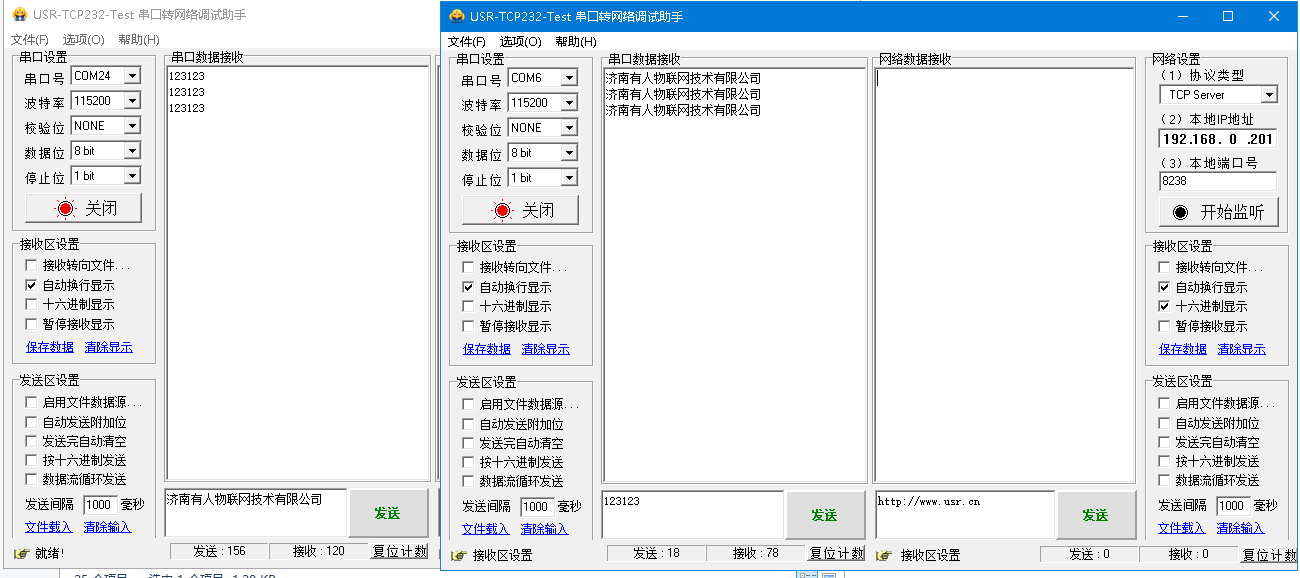 2、打開兩個USR_TCP232_Test軟件,一個連接COM24,一個連接虛擬串口COM6,實現(xiàn)兩個串口直接數(shù)據(jù)互發(fā)。