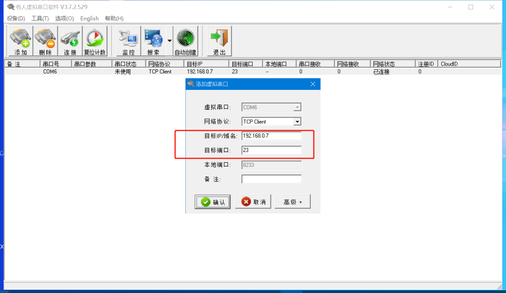 1、打開虛擬串口軟件,點擊“添加”在彈出的窗口中設置虛擬串口信息,由于上述ED2設備采用TCP server協(xié)議,所以此處網(wǎng)絡協(xié)議設置為TCP client。目標IP和目標端口與上述步驟中的電腦端設置一樣。然后點擊“確定”,建立虛擬串口COM6。