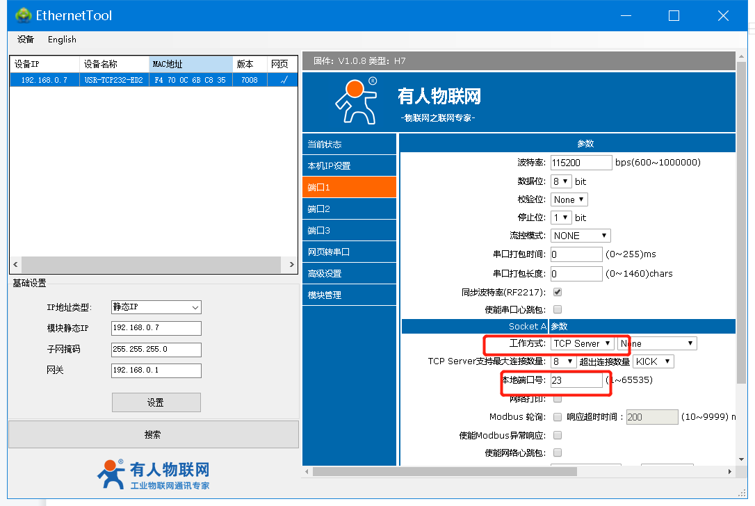 將軟件串口設置中的串口號配置為COM24。由于設備默認協(xié)議類型為 TCP server ,所以電腦端需要設置為 TCP client,IP和端口號為模塊的IP:192.168.0.7和端口號:23。