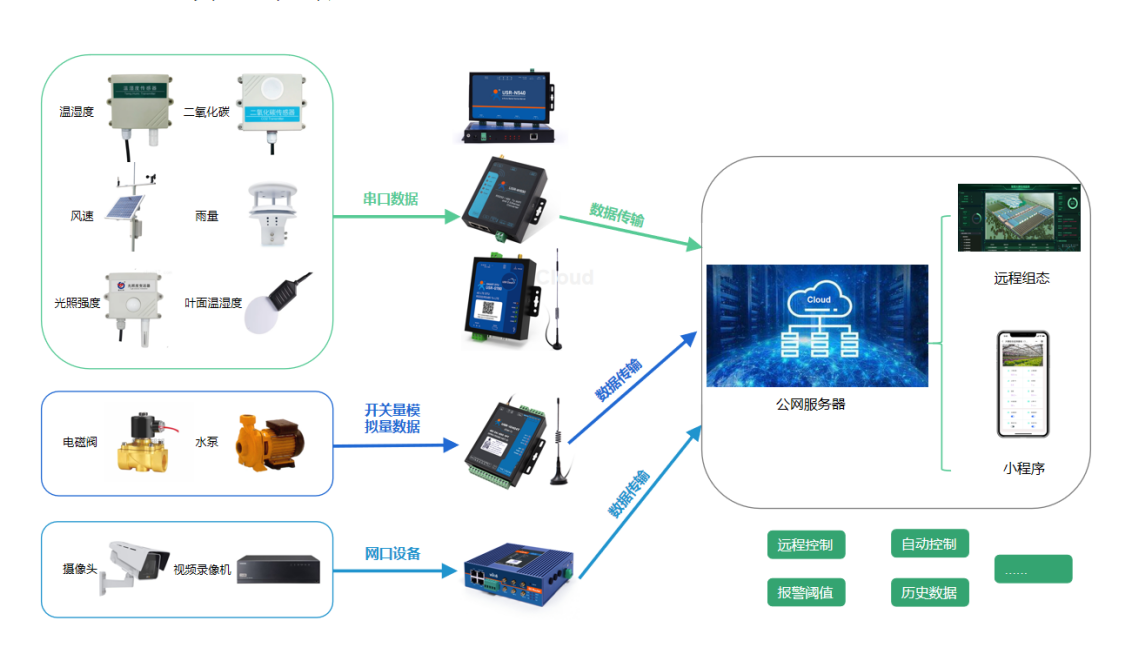 v 若現(xiàn)場(chǎng)終端設(shè)備為開(kāi)關(guān)量或模擬量設(shè)備,可以通過(guò)網(wǎng)絡(luò)IO設(shè)備將數(shù)據(jù)傳輸至公網(wǎng)服務(wù)器。若現(xiàn)場(chǎng)有4G信號(hào)可選用網(wǎng)絡(luò)IO中CAT1或G5版本;若現(xiàn)場(chǎng)方便布線或有wifi覆蓋可選用EWR版本;